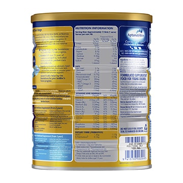 Formulated supplementary food for young children. Specially designed to supplement the normal dietary needs of toddlers, when their intakes of energy and nutrients may not be adequate. "Department of Health and Ageing, National Health and Medical Research Council, Ministry of Health Nutrient Reference Values for Australia and New Zealand Including Recommended Dietary Intakes, Canberra: Commonwealth of Australia, 2006. Based on a comparison of the nutritional requirements between 1-3 year old toddlers and male adults, per kg of body weight (based on 70kg adult and 12kg toddler).